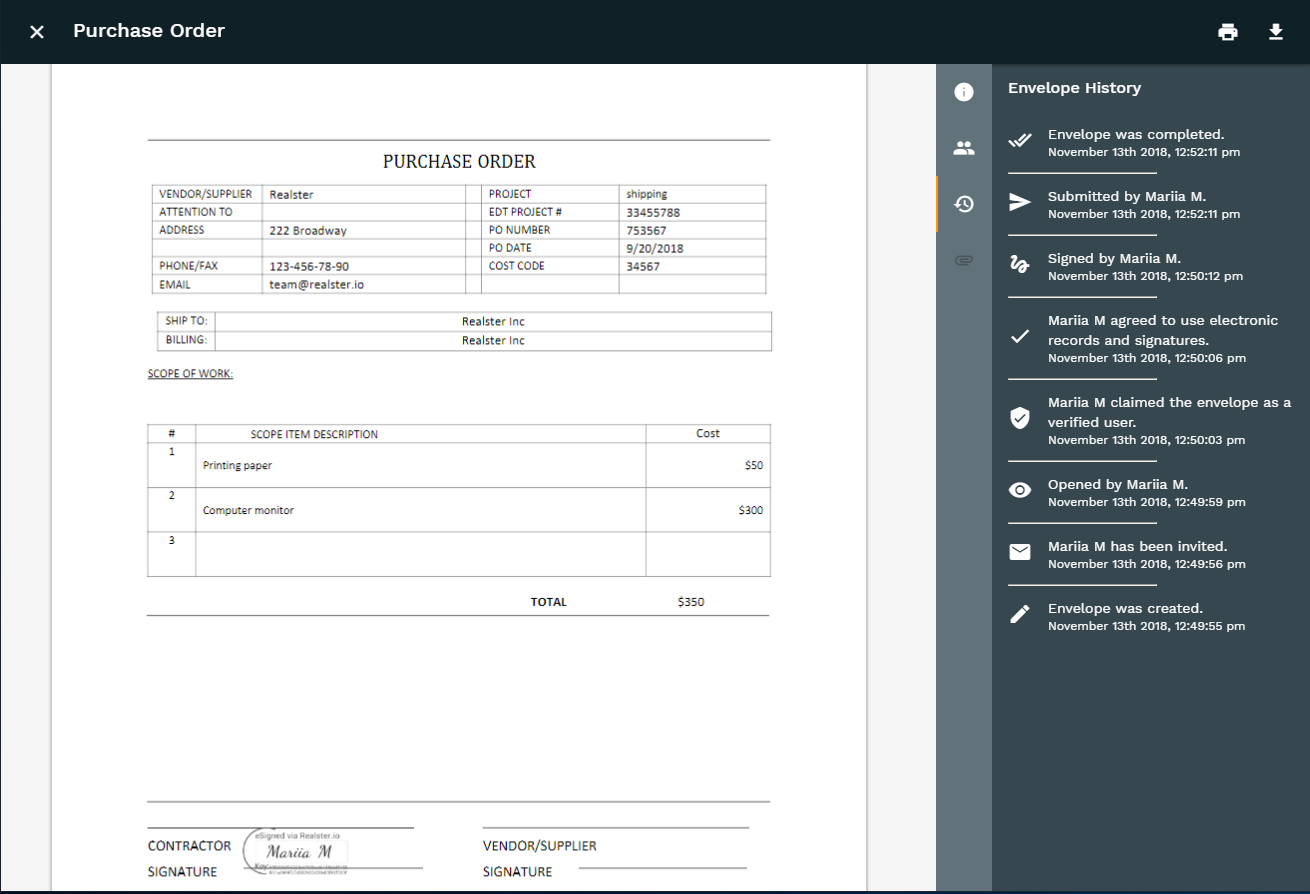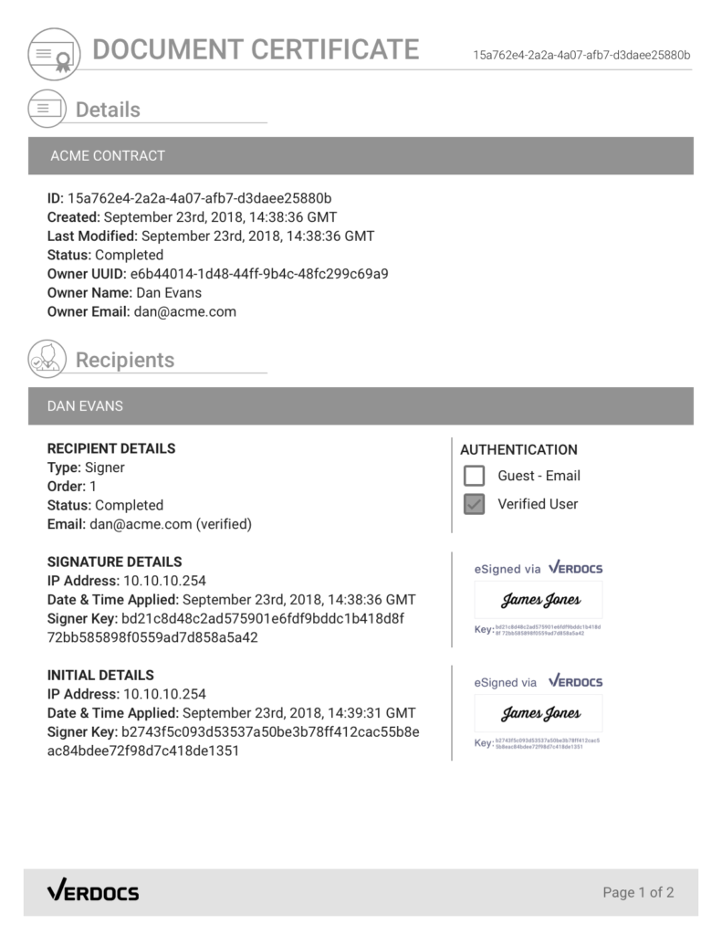 Upon Verdoc completion, a digitally signed, tamper-proof PDF Certificate is generated and shared to all participants as a separate attachment. The certificate is also available in the Details page for future access through the original invitation link. The certificate recaps granular data about the Verdoc details, recipients, and event history in PDF format. With this functionality, you can be confident that all of your electronic signatures are protected by the Uniform Electronic Transactions Act.